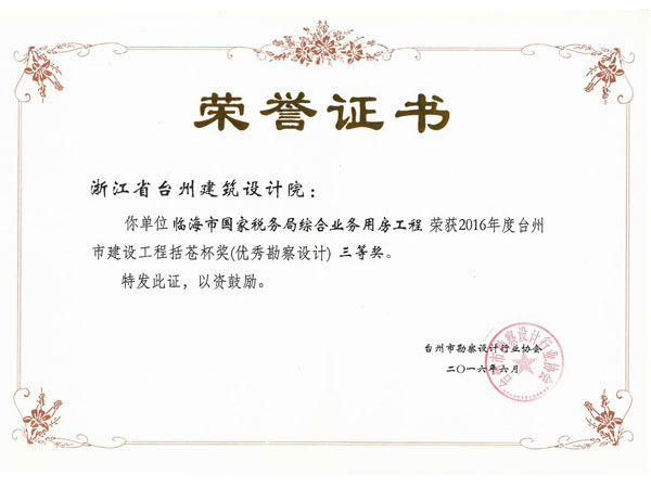 臨海國家稅務局綜合業務用房工程獲2016括蒼杯獎(優秀勘察設計)三等獎